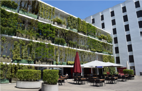 Das begrünte Gebäude heizt sich in der Sonne nicht so stark auf. Deshalb bleibt es innen und außen kühler. Außerdem verdunsten die Pflanzen an der Fassade und auf dem Dach Wasser, wodurch die direkte Umgebung abkühlt. Bei Gründächern ist eine Kühlung der direkten Umgebung um 1,5 Grad Celsius nachgewiesen.