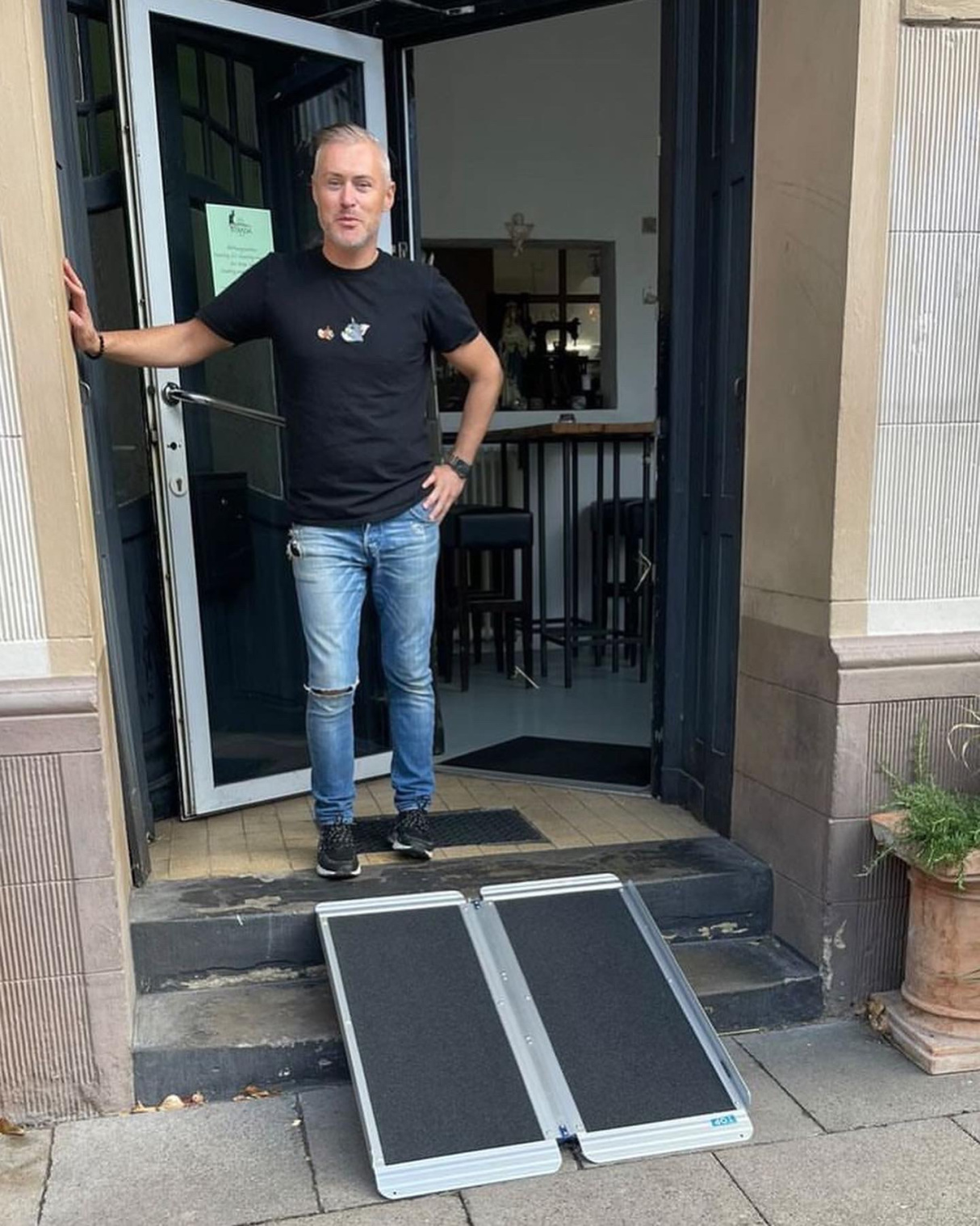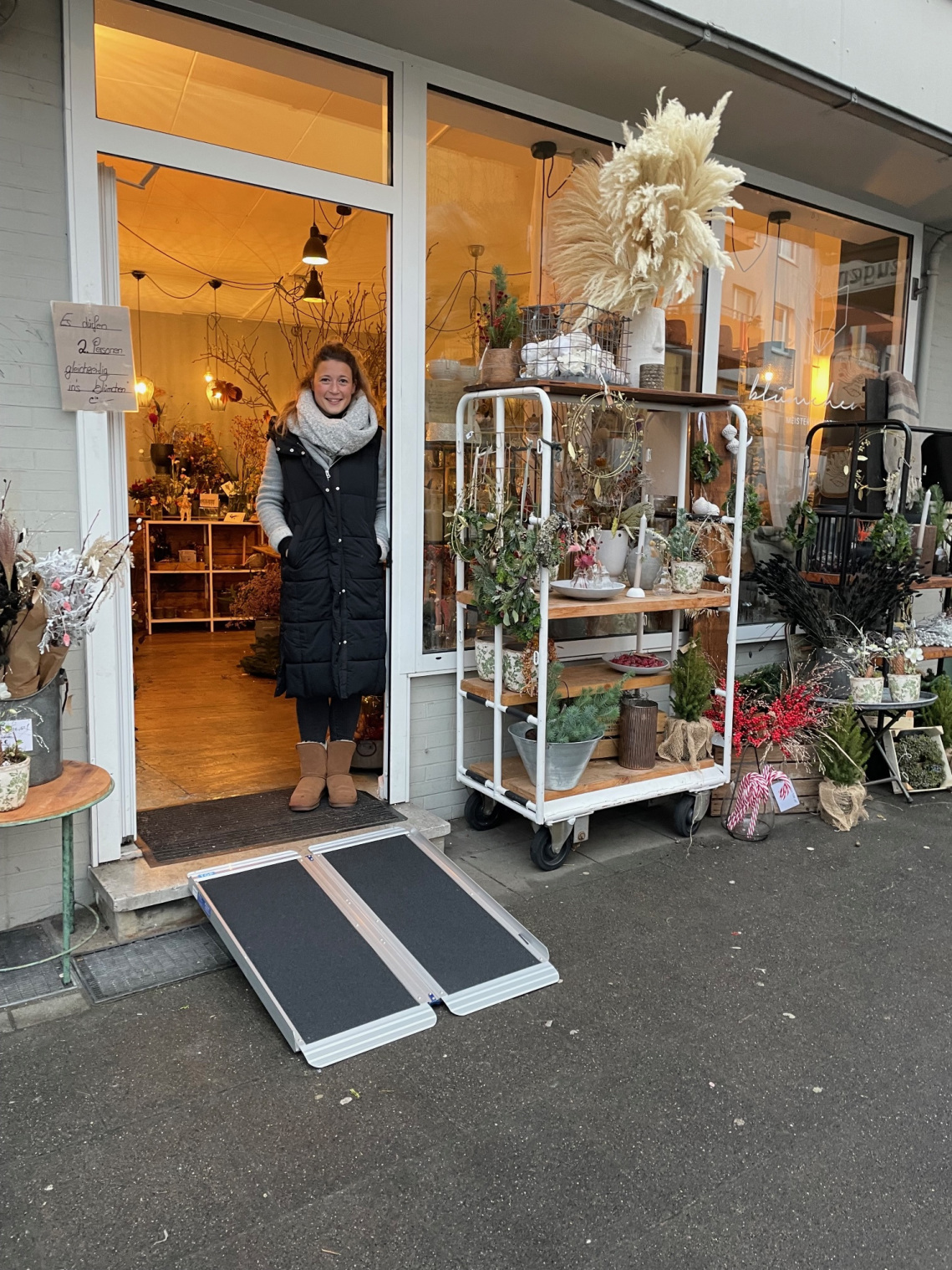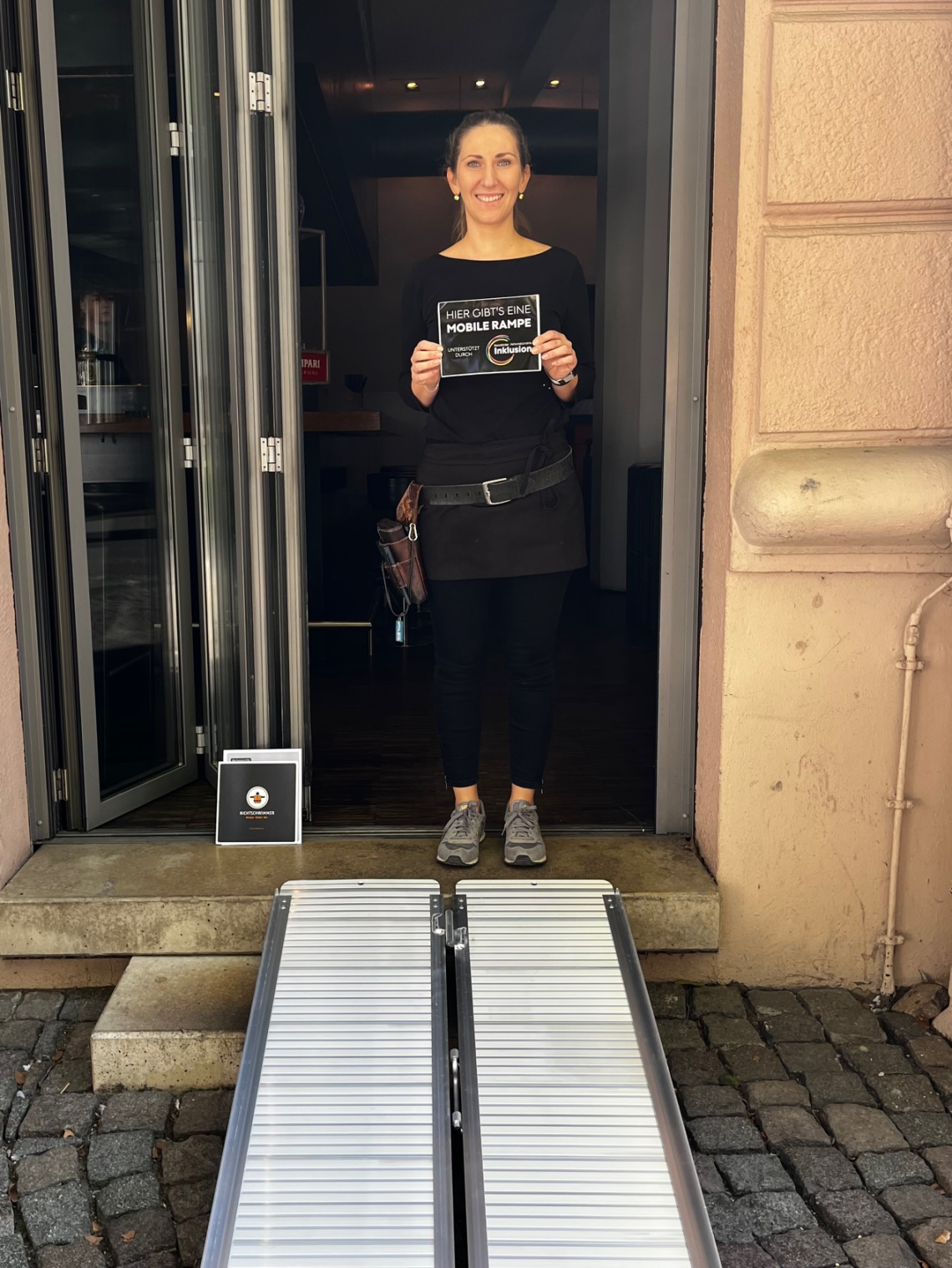 • Das Geschäft kann diese Rampe dann draußen vor die Tür stellen und bei Bedarf damit die Barriere abbauen