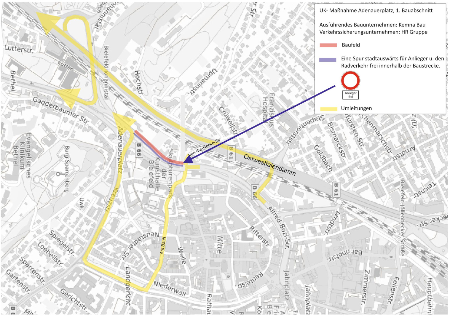 Die Baumaßnahme startet am Adenauerplatz im Bereich der Artur-Ladebeck-Straße (stadtauswärts) und an der Auffahrt Johannistal zum Ostwestfalendamm (OWD).
