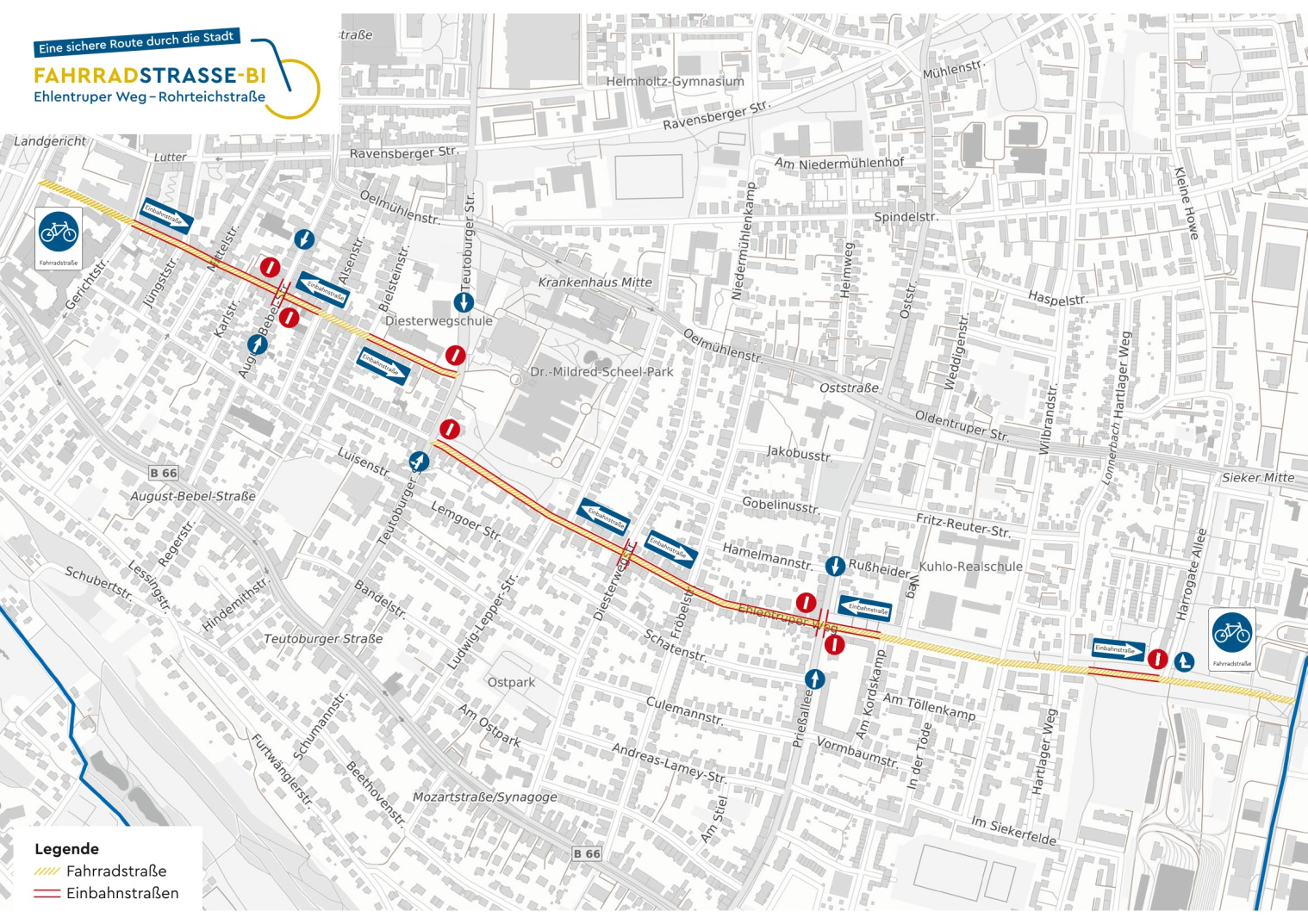 Die Verkehrsführung für Kraftfahrzeuge ändert sich durch Einbahnstraßenregelungen. Während der ersten Testphase ist die Einfahrt in die Rohrteichstraße und in den Ehlentruper Weg von der August-Bebel-Straße, der Teutoburger Straße und der Prießallee für Kraftfahrzeuge nicht möglich. Nicht nur mit dem Fahrrad, auch zu Fuß können weiterhin beide Richtungen genutzt werden. Auf der Fahrradstraße werden die Vorfahrtsregeln dahingehend angepasst, dass diese Vorrang erhält. Hiervon ausgenommen sind die querenden Hauptverkehrsstraßen Prießallee, Teutoburger Straße und August-Bebel-Straße.