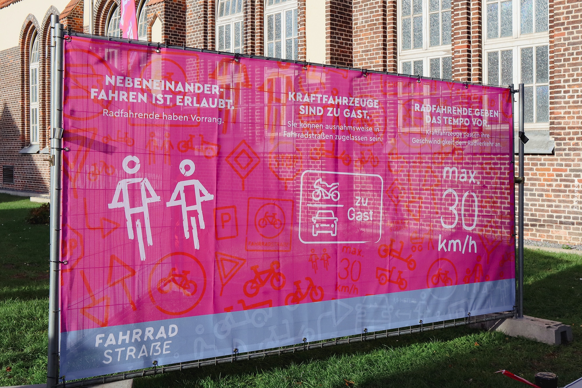 Die Einrichtung von Fahrradstraßen ist ein wichtiges Element der Umsetzungsstrategie für den Radverkehr, mit dem Ziel den Individualverkehr bis zum Jahr 2030 auf 25 % zu reduzieren. Fahrradstraßen sind generell dem Radverkehr vorbehalten, Kraftfahrzeuge können ausnahmsweise zugelassen werden. Es darf nebeneinandergeradelt werden, die Radfahrenden geben das Tempo vor. Diese und weitere Infos sind in einem neuen Flyer zusammengefasst und an einigen Bannern und Plakaten im Ehlentruper Weg/Rohrteichstraße sichtbar. Weitere Kanäle und die Umsetzung vor Ort folgen, um generell über Fahrradstraßen zu informieren.