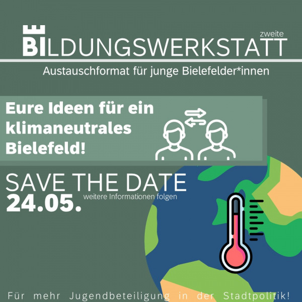 Welche Ideen haben junge Bielefelder*innen für ein klimaneutrales Bielefeld? Darüber möchte die Stadt Bielefeld gerne mit euch in der 2. Bildungswerkstatt am 24. Mai ab 16 Uhr diskutieren. Merkt euch schon mal den Termin! Weitere Informationen folgen.
