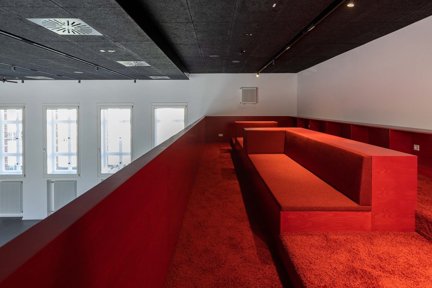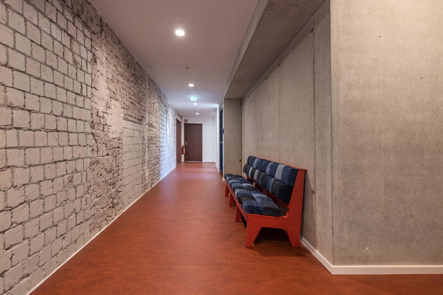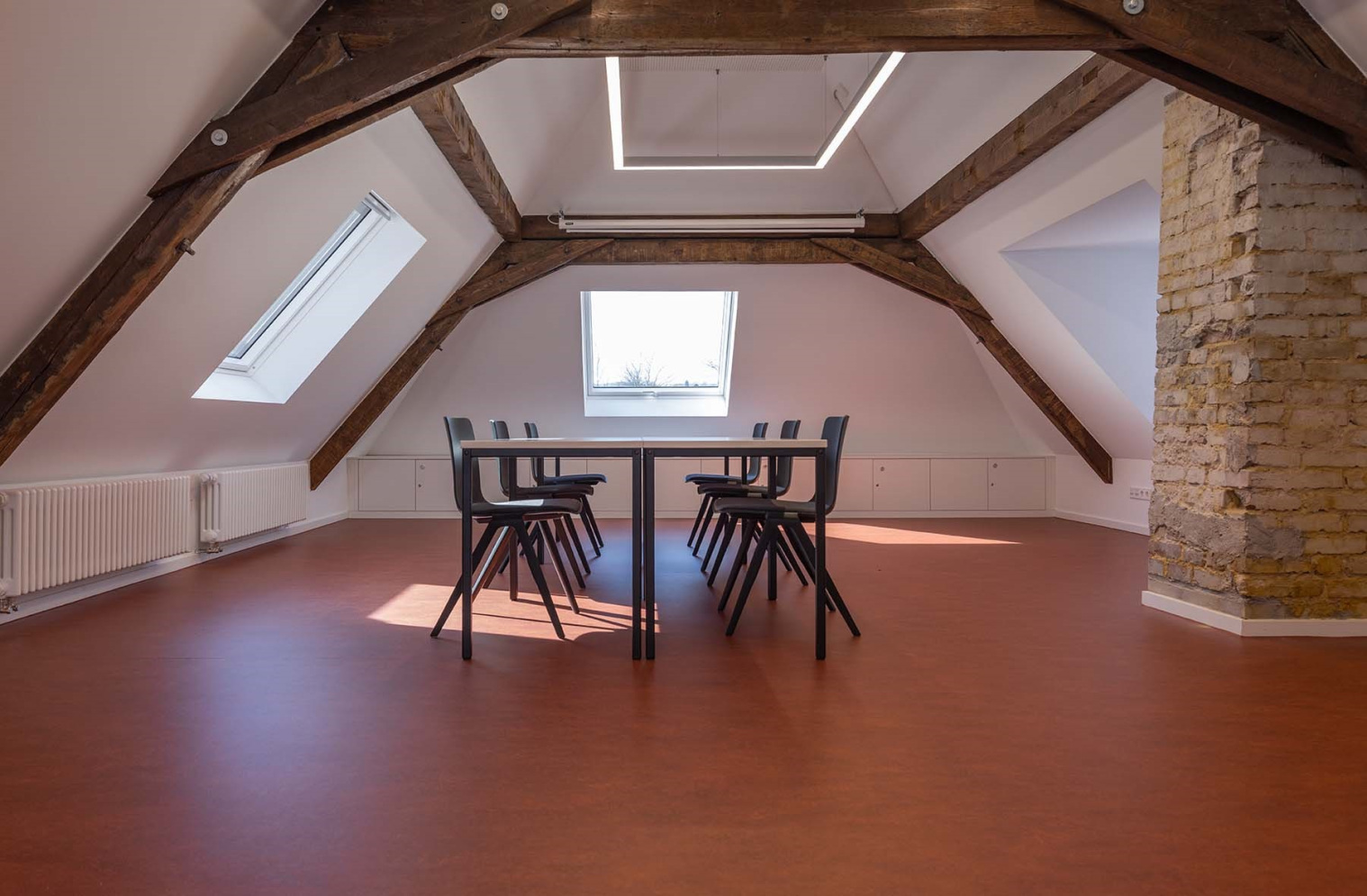 Das Dachgeschoss wurde komplett neu ausgebaut. Bisher befand sich hier eine Wohnung, die zur temporären Unterbringung von Bands genutzt wurde. Nun entstanden zwei Multifunktionsräume und Büroräume, sowie ein barrierefreies WC.