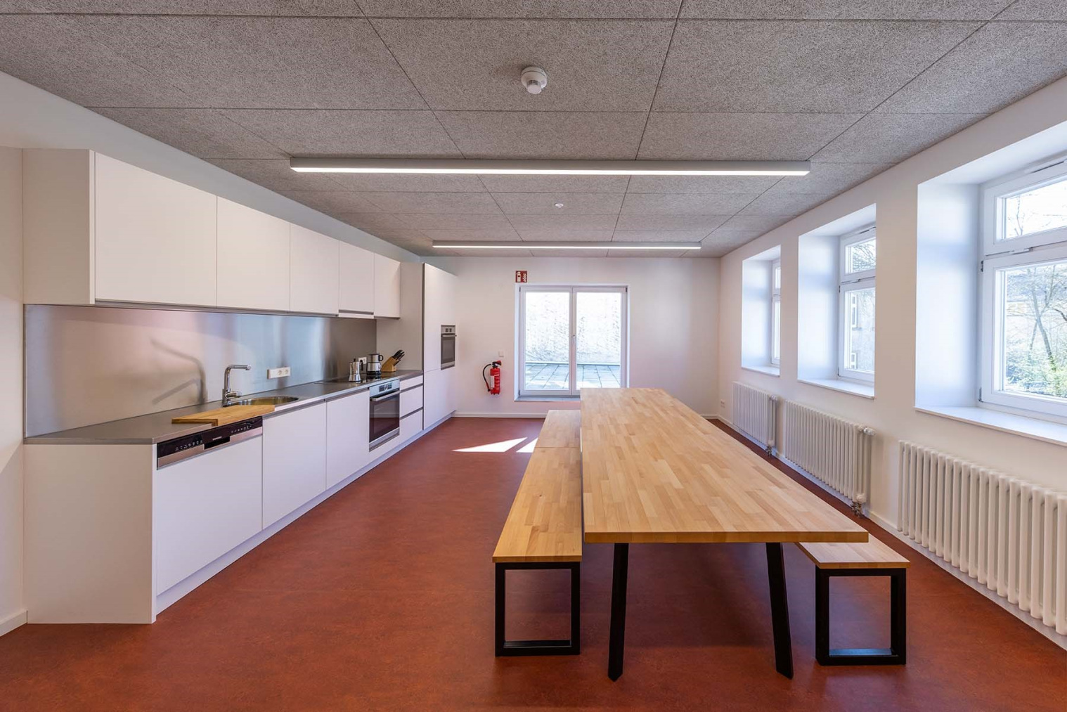 Für die barrierefreie Erschließung des Gebäudes inklusive des Dach- und Kellergeschosses wurde ein Fahrstuhl ins neu angebaute Treppenhaus integriert. Ein zweites Treppenhaus wurde innerhalb des Bestandgebäudes neu errichtet.