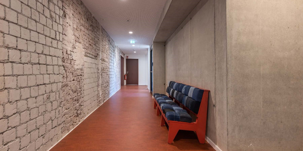Die Außenwände erhielten eine Innendämmung, um das ursprüngliche Erscheinungsbild des Gebäudes im Stadtraum weitestgehend zu erhalten. Das Graffiti an der Fassade wurde entfernt und die Kellerwände wurden mit einer Außendämmung versehen.