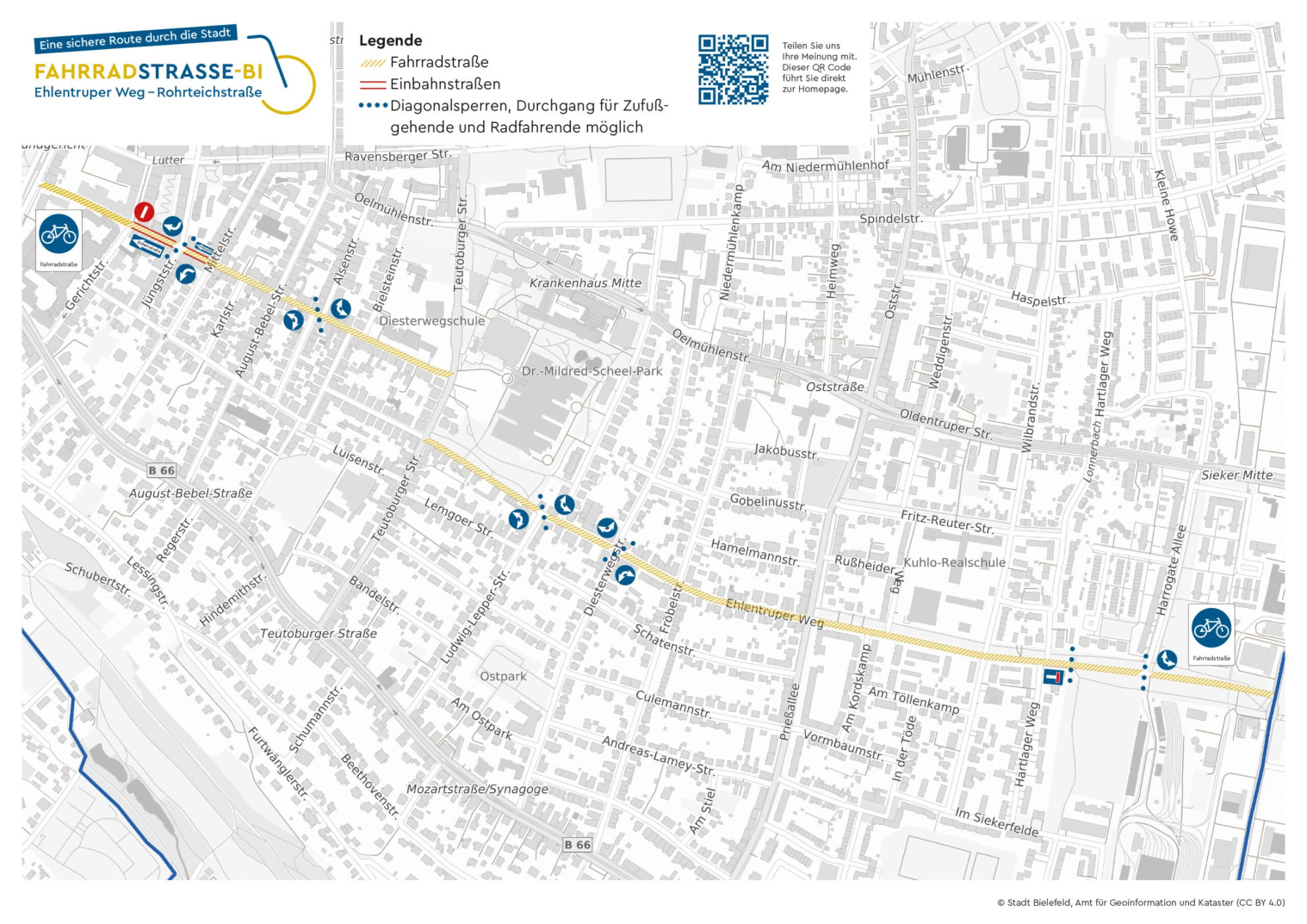 Die Übersichtskarte zeigt die veränderte Verkehrsführung. Alle Informationen zur Fahrradstraße Ehlentruper Weg–Rohrteichstraße finden Sie hier. Auf der Seite haben Sie auch die Möglichkeit Ihre Anregungen zur geänderten Verkehrsführung auf einer interaktiven Karte zu markieren.
