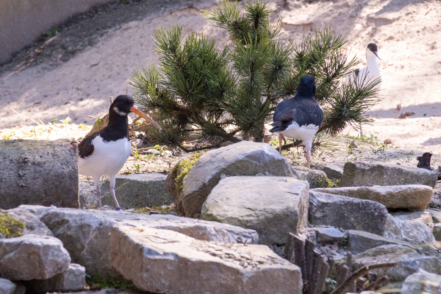 Beim Austernfischer (Haematopus ostralegus) sind bereits zwei neue Vögel eingetroffen. Das Weibchen soll mit dem alteingesessenen Bielefelder Hahn verpaart werden. Austernfischer werden relativ spät, im Alter von drei bis vier Jahren, geschlechtsreif. Die sind Nistplätze vielfältig: In Frage kommen Sand- oder Kiesstrände und auch felsige Strände, die nicht von der normalen Flut erreicht werden, Dünen oder Muschelbänke. Doch nicht nur die Küste dient ihr als Lebensraum, landeinwärts fühlt sich die „See-Elster“ auch am Uferbereich von Flüssen oder auf Feldern und Wiesen wohl, sofern dort das Nahrungsangebot stimmt. Austernfischer ernähren sich bevorzugt von Muscheln, wobei manche der Vögel sich als „Stecher“ verhalten und durch die kleinste Öffnung zwischen den beiden Muschelklappen hindurchstechen. Die „Hammer“ hämmern solange ein, bis sie ein Loch durch die Muschelschale schlagen. Ein Großteil der Nahrung besteht aber aus Regenwürmern.