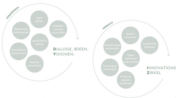 - Die Mitglieder eines Innovationszirkels binden ihre jeweiligen Netzwerke ein, um Arbeitsstände zu prüfen und Anpassungsvorschläge zu unterbreiten.