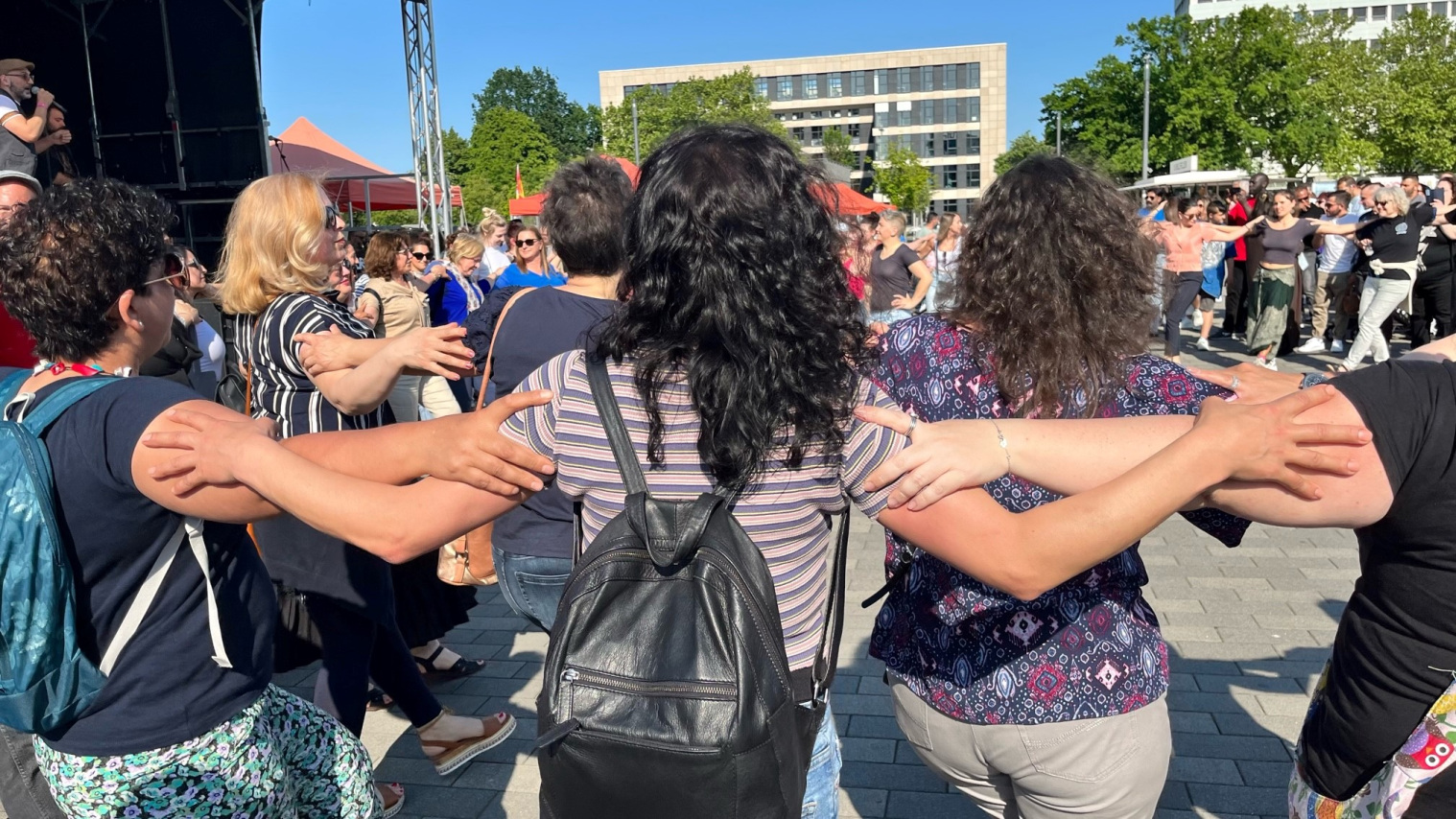 „Einfach großartig“, so Dezernent Ingo Nürnberger, nachdem er Arm in Arm mit Besucher*innen des Festes zur Musik von „The Greek Company” Sirtaki getanzt hat. Von 15 bis 22 Uhr konnten die Besucher*innen neun Bands sehen und sich in Themenzelten live und interaktiv über verschiedene Formen von Rassismus informieren. Zu den musikalischen Live-Acts gehörten Lasse b2b Creezy (Not Exist), Moh Kanim feat. Patrick Macanda + DJ, WAHDAT, Crazie Nabz, RRR, D.E.M., Mina Richman und Hidayet. Weitere Beiträge stammten von Vertreter*innen der Bildungsinitiative Ferhat Unvar e.V. Die Ausstellung „Was ihr nicht seht“ machte sichtbar, welchem Alltagsrassismus schwarze Deutsche ausgesetzt sind. Für Kinder stand das Spielmobil bereit und eine Vielfalt von Speisen und Getränken rundete das abwechslungsreiche und informative Fest auf dem Kesselbrink ab.