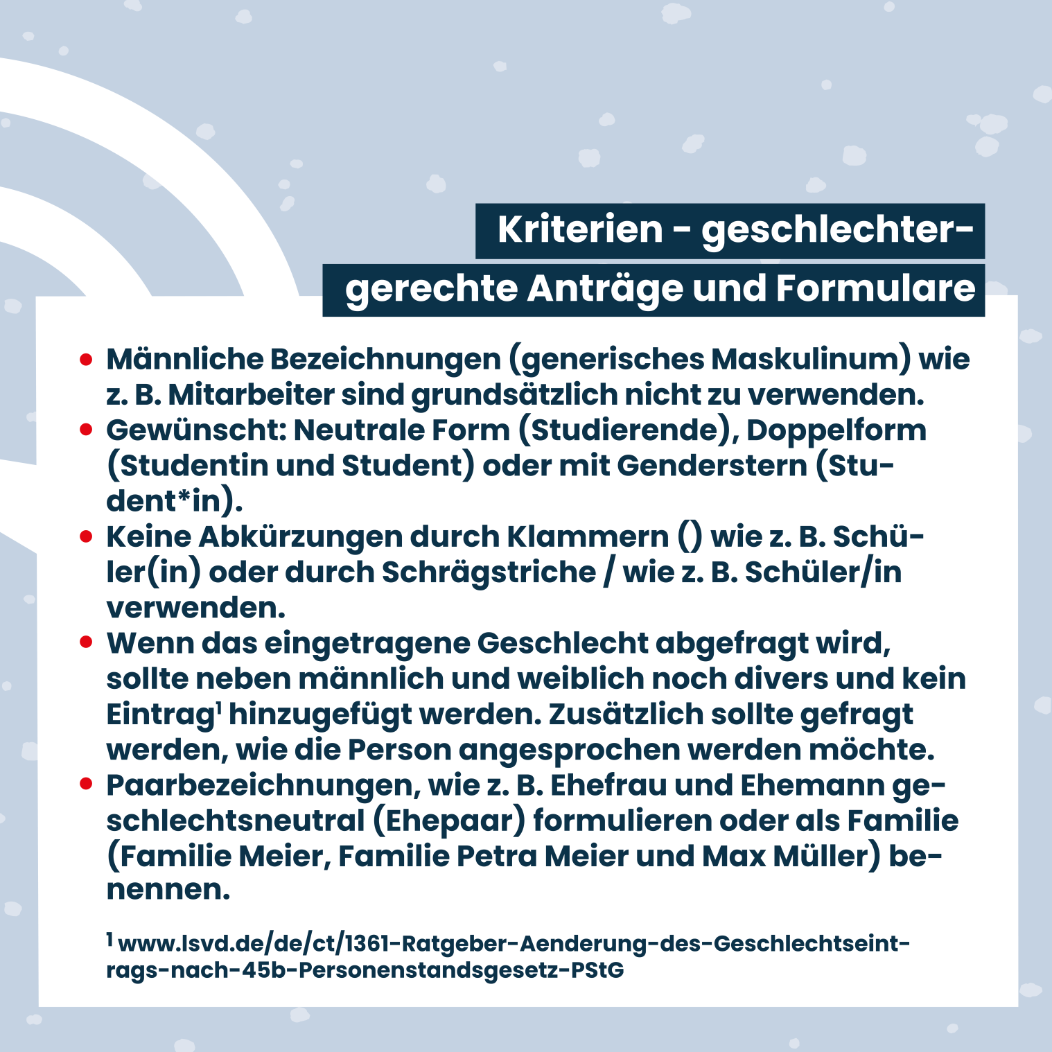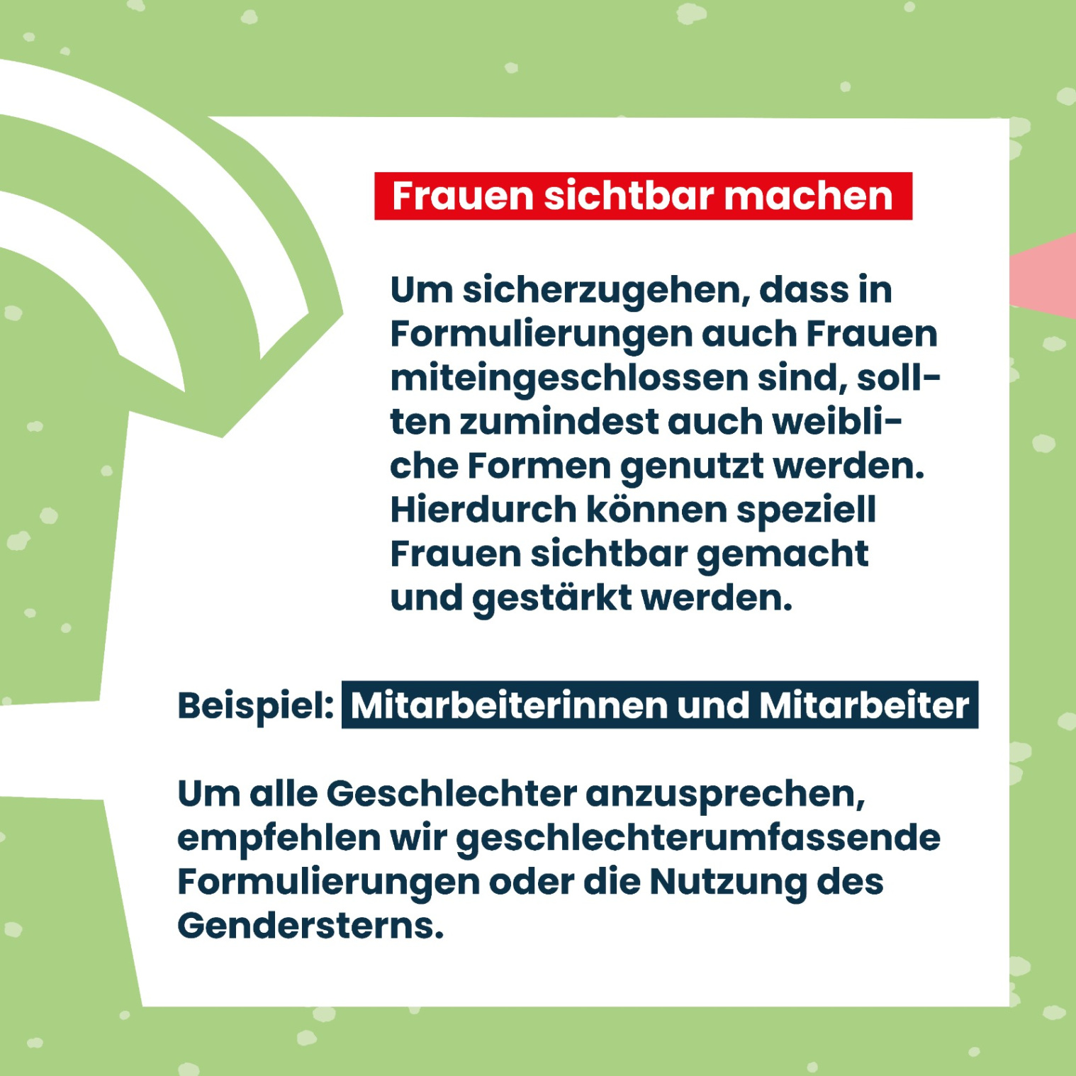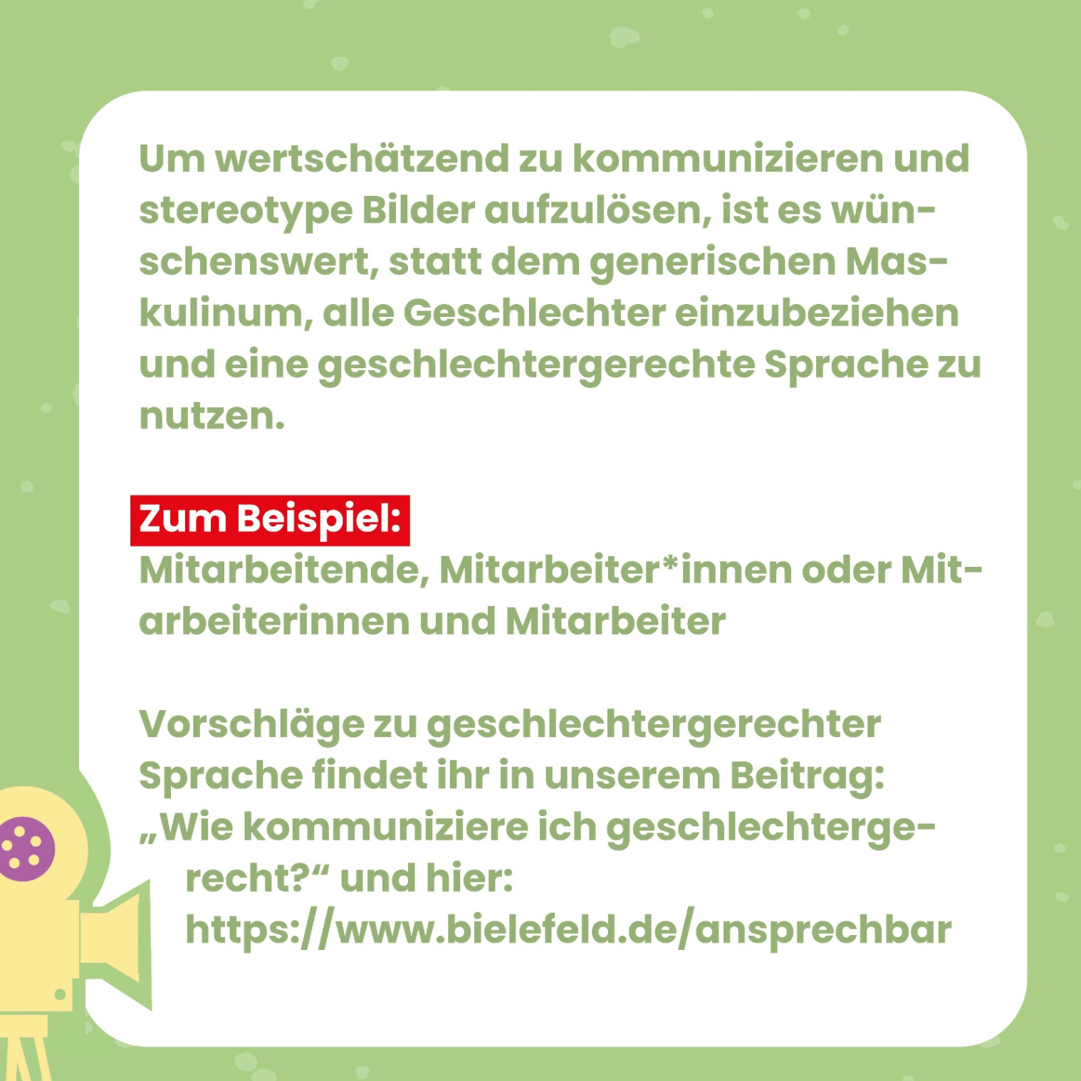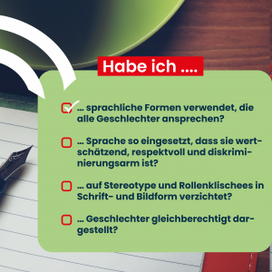 Social Media Posts Geschlechtergerechte Sprache Checkliste geschlechtergerechte Sprache Geschlechtergerechte Sprache bei Anträgen und Formularen Leitfaden Anschreiben geschlechtergerechte Sprache Geschlechtergerechte Formulierungen bei Ausschreibungen Komplimente, die keine sind - Alter Komplimente, die keine sind - Geschlecht Komplimente, die keine sind - Sexuelle Identität Komplimente, die keine sind - Kultur und Ethnie Komplimente, die keine sind - Behinderung Wertschätzende Kommunikation - Vielfalt Wertschätzende Kommunikation - Alter Wertschätzende Kommunikation - Geschlecht Wertschätzende Kommunikation - Sexuelle Identität Wertschätzende Kommunikation - ethnische Herkunft und Kultur Wertschätzende Kommunikation - Behinderung Sprache erzeugt Bilder