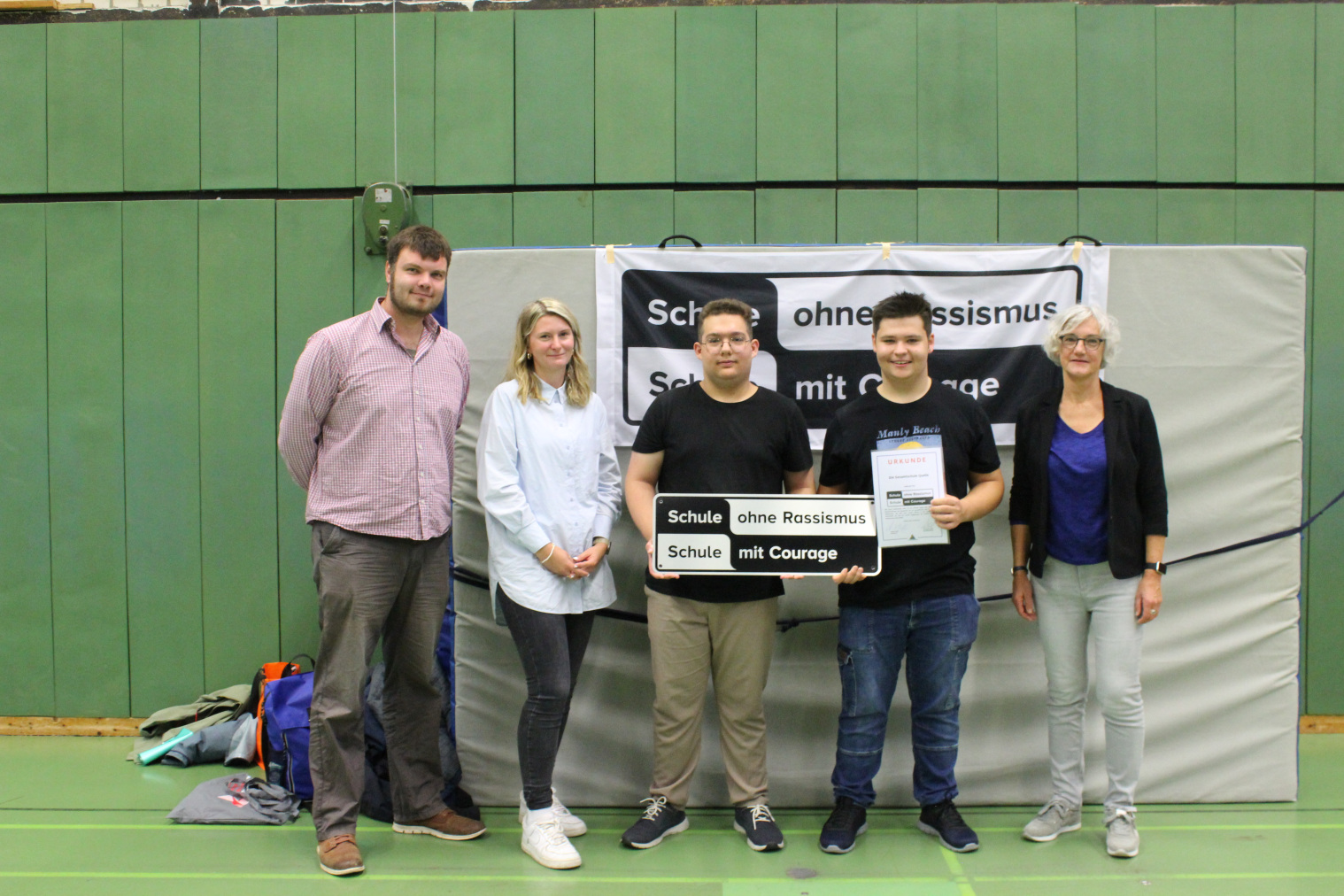 Brigitte Mundt vom Kommunalen Integrationszentrum als Regionalkoordinatorin hat die Urkunde für die Schule mitgebracht und verlieh die Auszeichnung der vierten von fünf Gesamtschulen in der Stadt: „Die Bielefelder Gesamtschule ist die 29. Schule, die in das Netzwerk SOR-SMC in Bielefeld aufgenommen wird. Was mich besonders freut ist, dass sich die Schülervertretung und Abdu Eker und Joel Purschian als Schülersprecher fast zwei Jahre stark gemacht haben, damit eure Schule eine Schule ohne Rassismus – Schule mit Courage wird“, sagte Brigitte Mundt zur Begrüßung der etwa 1.000 Schülerinnen und Schüler sowie der 100 Lehrkräfte.