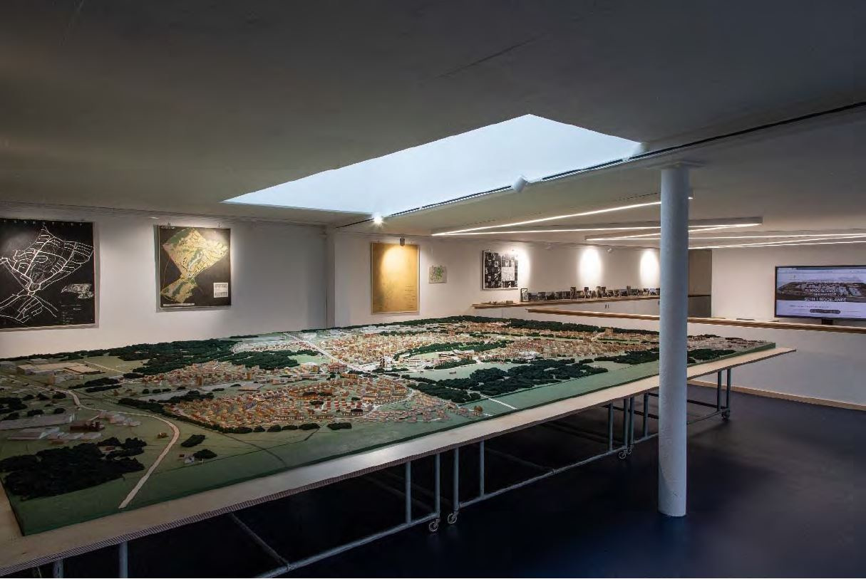 Das Untergeschoss wird in drei Nutzungsbereiche gegliedert: Der erste Nutzungsbereich umfasst den Ausstellungsraum für das knapp 30m² große historische Sennestadtmodell (Wettbewerbsmodell aus dem 50er Jahren, weitgehend im Originalzustand) mit Übergang in einen Tagungsbereich. Der Tagungsbereich bietet Platz für Workshops, Tagungen, Vereinssitzungen sowie kulturelle Veranstaltungen bis zu einer Teilnehmerzahl von 25 Personen. Der zweite Nutzungsbereich stellt der Infopoint und der Arbeitsplatz des Stadtteilmanagements dar. Im dritten Nutzungsbereich ist eine temporäre Büronutzung in Form einer Co-Working-Area geschaffen worden. Dieser Bereich bietet temporäre Arbeitsplätze incl. Lagerungsmöglichkeiten. Das Erdgeschoss und das Obergeschoss werden aufgrund der baulichen Gegebenheiten als gemeinsame Bürofläche derzeit an ein Architekturbüro vermietet.