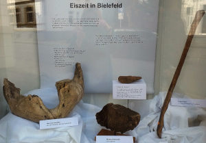 Teile eines Mammuts aus dem Naturkunde-Museum (namu) Bielefeld haben sich in die Arndtstraße verirrt. Die ungewöhnliche Dekoration aus Knochen und Zähnen erregte sofort Aufmerksamkeit unter den Vorbeigehenden. Marion Scheuer und Heinz-Dieter Zutz, die im namu ehrenamtlich verantwortlich sind für die archäologischen Sammlungspflege, haben die Mammutfossilien in die Innenstadt gebracht. Unterstützt wurden sie von Verleger Roland Siekmann, der das Schaufenster des tpk-Verlags für das Projekt zur Verfügung stellt. Abwegig ist die Anwesenheit eines Mammuts im Bielefelder Westen jedoch nicht: Während des Eiszeit lebten die Urtiere in der Senne.