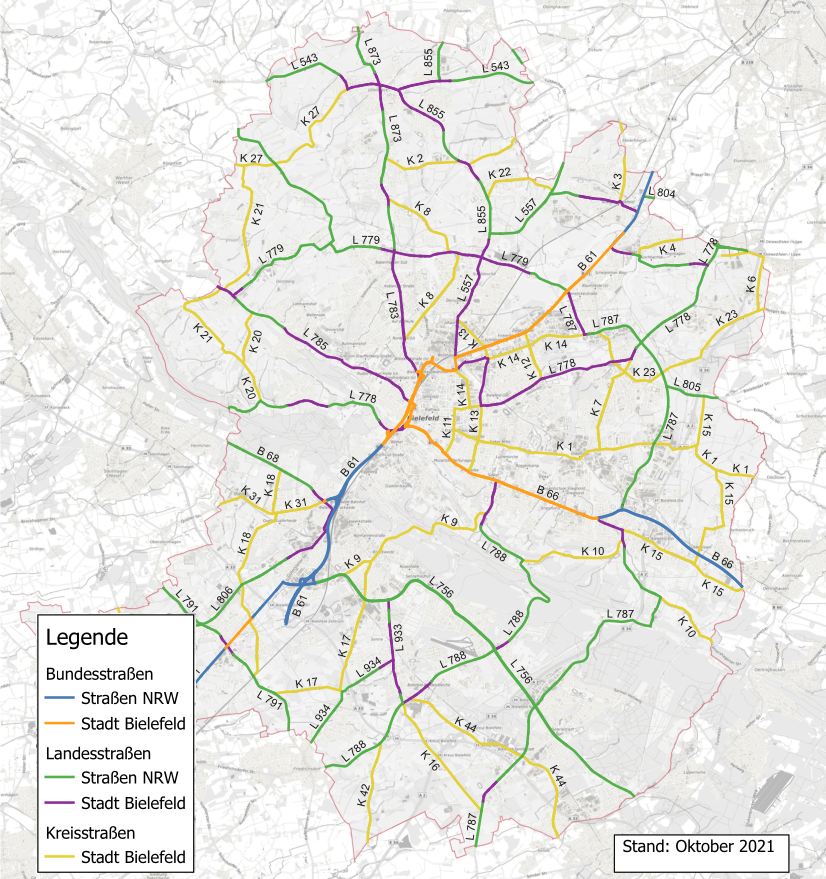 Die Stadt Bielefeld ist das Oberzentrum in Ostwestfalen-Lippe und somit ein wichtiger Wirtschaftsstandort für die Region. Mit seinen mehr als 330.000 Einwohner*innen, täglich über 85.000 Einpendler*innen und nahezu 50.000 Auspendler*innen werden enorme Herausforderungen an eine leistungsfähige Infrastruktur mit gut ausgebauten und sicheren Straßen- und Wegeverbindungen gestellt. Einen großen Anteil am Verkehrsaufkommen hat dabei der motorisierte Individualverkehr (MIV). Kraftfahrzeuge zur individuellen Nutzung, wie Pkw oder Krafträder, werden zum MIV gezählt.