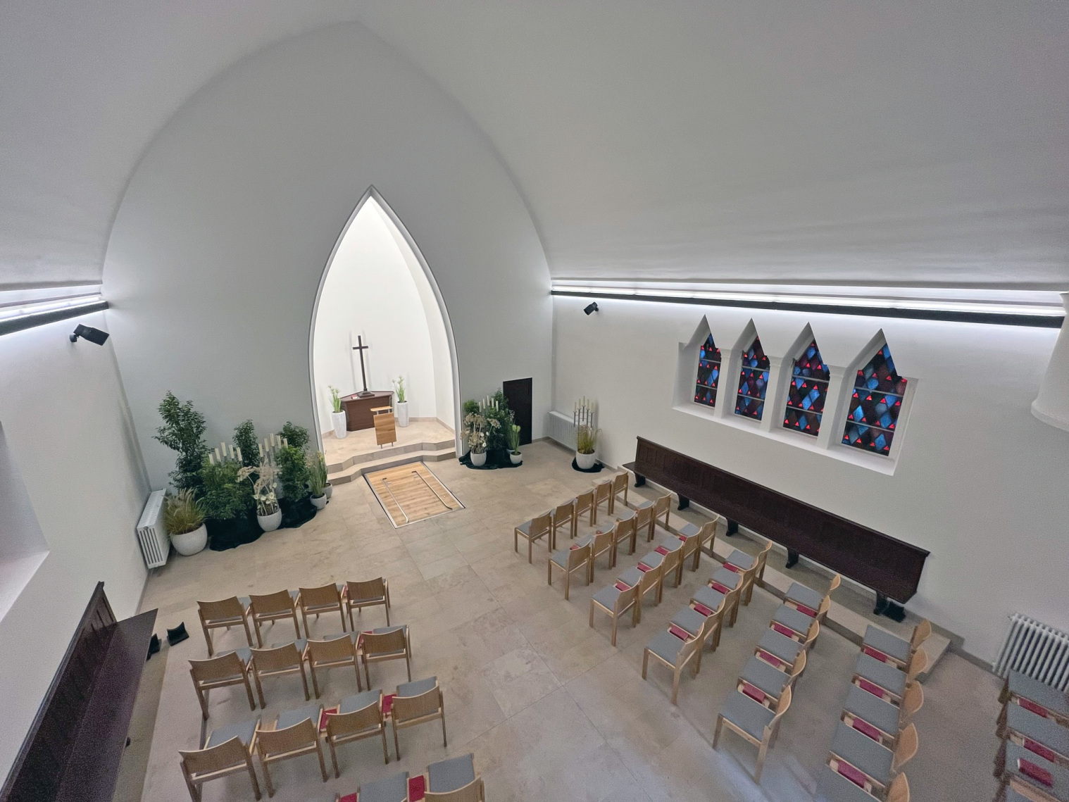 Knapp 100 Jahre nach dem Bau der Kapelle wurde deren Innenraum 2022 umfassend saniert. Alle Arbeiten wurden auf Grund des Denkmalschutzes mit der unteren Denkmalbehörde abgestimmt. Die helle, freundliche Atmosphäre sorgt zusammen mit der neuen Beleuchtung für wirkungsvolle Veränderungen. Durch die frische Wandfarbe, den beigen Bodenfliesen in Solnhofener-Optik und die geschickt platzierten LED-Lampen erscheint der Innenraum hell und freundlich. Durch die Veränderungen kommt nun auch das schöne, farbenfrohe Lichtspiel der seitlichen historischen Bundglasfenster im Inneren der Kapelle zur Geltung, dass die Anwesenden sanft umgibt und Geborgenheit vermittelt. Die neuen Eichenstühle mit einem hellen, grauen Sitzpolster runden die Umbaumaßnahmen ab.