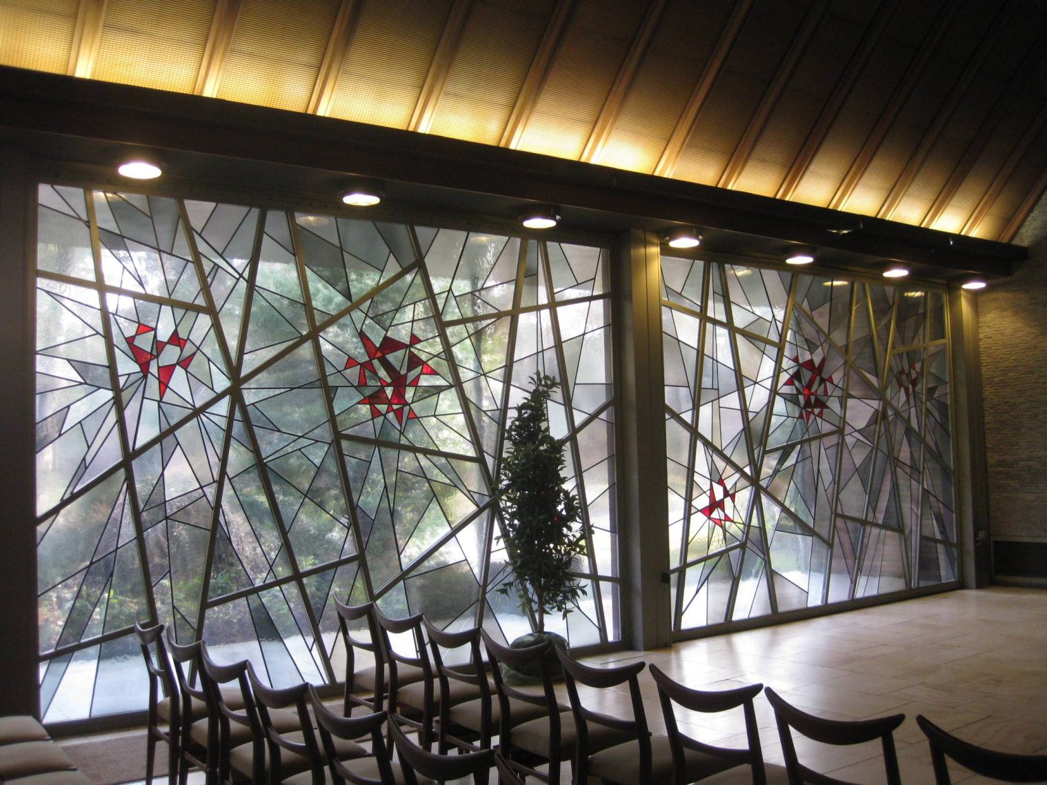 Die linke Abschlusswand der Kapelle zieren besondere Fenster aus Rauchglas, die der Künstler Wilhelm Heiner (1902- 1965) im Jahr 1961 schuf. Auch das zentrale Mosaikkreuz stammt von ihm.