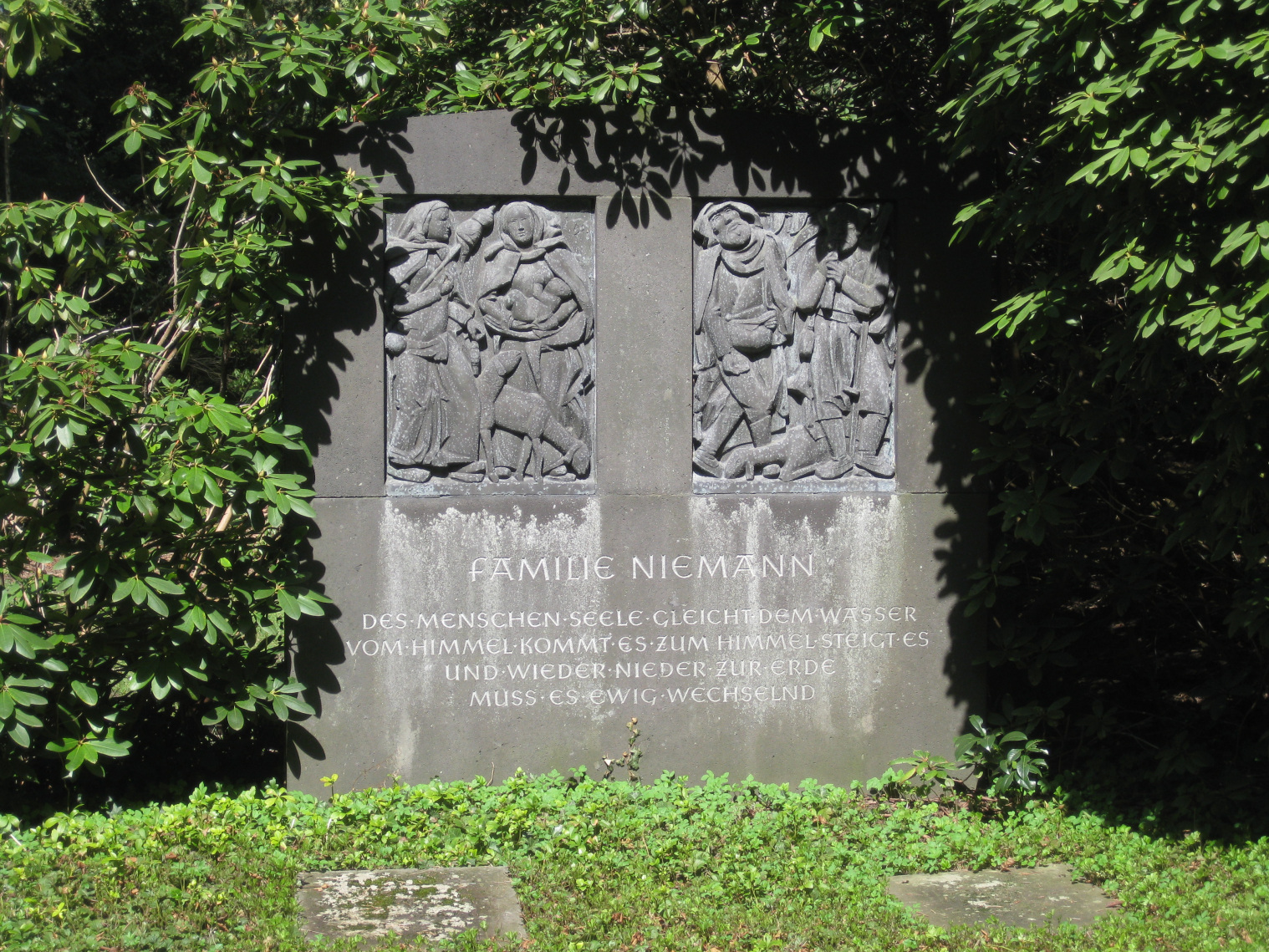 1947 erschuf der in Werther beheimatete Bildhauer und Maler P.A. Böckstiegel (1889 – 1951) das auf einem breiten Basaltstein stehende Grabmal. Die beiden Bronzereliefs mit der Darstellung von je zwei Frauen und Männern symbolisieren den ewigen Kreislauf des Lebens: Saat und Ernte, Geburt und Tod. Das eingemeißelte Gedicht stammt von Goethe.