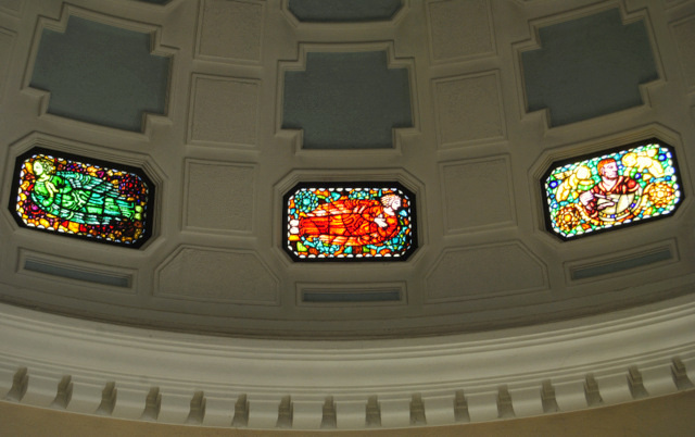 Der 16 Meter hohe Innenraum mit schlichten Wandfeldern zwischen Pilastern und einer kassettierten Kuppel erinnert an römische Großbauten. Vier der insgesamt 16 bunten Glasfenster zeigen die vier Evangelisten sowie schwebende Engel. Die Alte Kapelle verfügt über 24 Stühle und 40 Bankplätze.