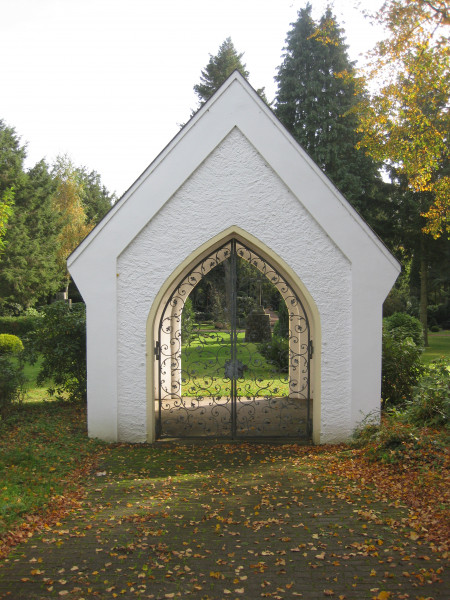 Der Alte Friedhof in Sennestadt, an der Bundesstraße B68 gelegen, wird optisch durch ein sehr ansprechendes Ensemble von Friedhofskapelle und Eingangstor bestimmt.
