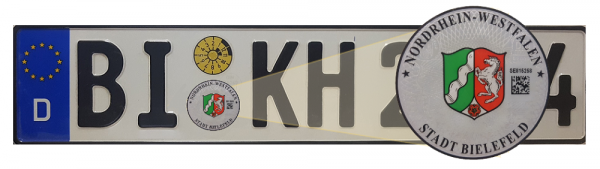 - Kfz-Kennzeichen mit Stempelplaketten und darauf aufgedrucktem QR-Code