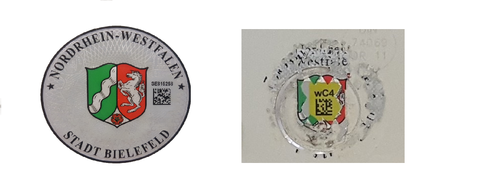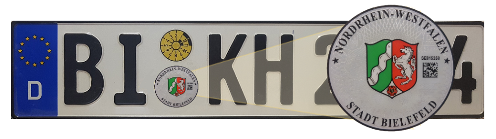 - Bisherige Kennzeichenschilder mit Stempelplaketten und darauf aufgedrucktem QR-Code (bei zugelassenem Fahrzeug)