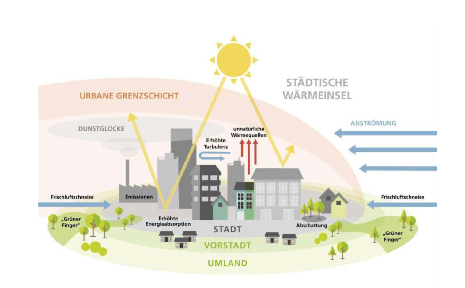 Insgesamt ist es in der Stadt wärmer, trockener und windärmer als im Umland. Unterschiedliche Oberflächen beeinflussen dabei stark die örtlichen Temperaturentwicklungen. So sind z.B. innerstädtische Grünflächen kühler als die versiegelten Oberflächen und überbauten Stadtbereiche.