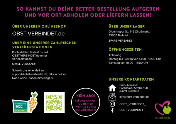 OBST-VERBINDET ist ein junges Start-Up aus Bielefeld (gegründet Juni 2021), das sich für mehr Wertschätzung von bereits produzierten Lebensmitteln einsetzt! Unser Konzept basiert auf Nachhaltigkeit entgegen jeglicher Art der Lebensmittelverschwendung. Durch die direkte Zusammenarbeit mit den Erzeuger:innen, Produzent:innen und Großhändler:innen retten wir aus den unterschiedlichsten Handelsstufen der Lieferkette diese wertvollen Waren (vorrangig Obst & Gemüse) und schließen damit eindeutig eine bisher unberücksichtigte Lücke entlang der Wertschöpfungskette.