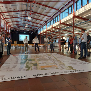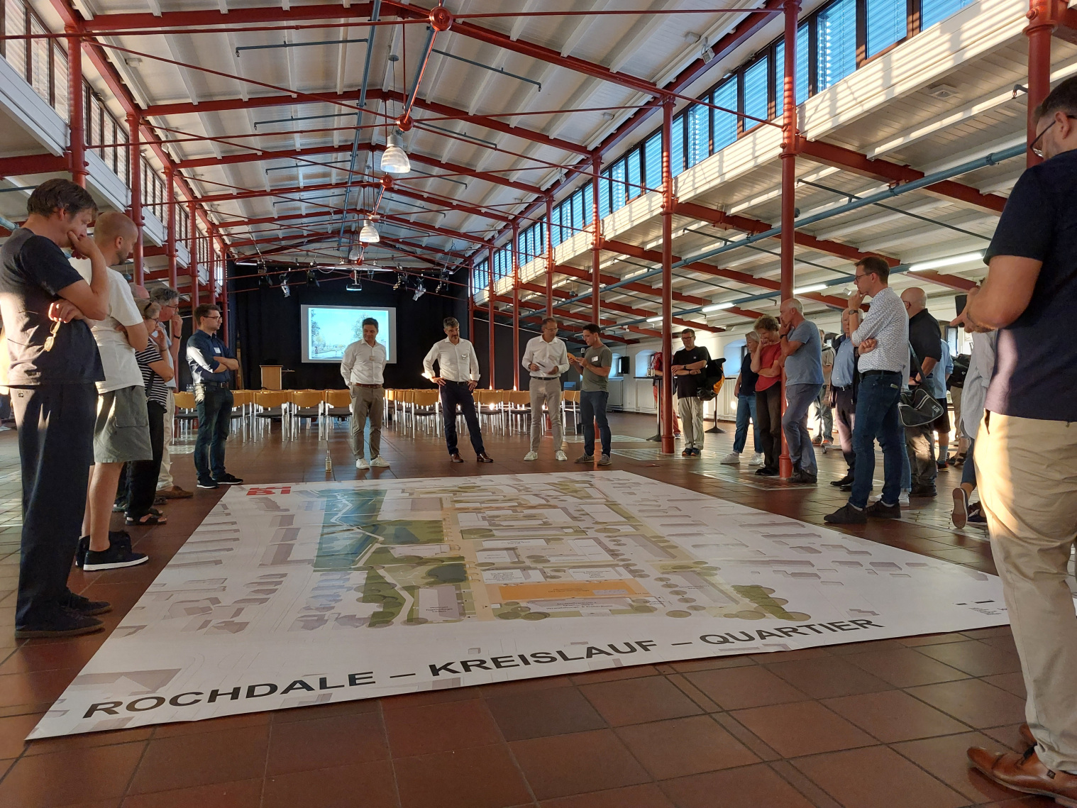 Am Montag, 21. September 2023, haben mehr als 50 Teilnehmende die Möglichkeit genutzt, mit den Planer*innen über das bisherige Konzept zur Weiterentwicklung des Rochdale-Areals zu diskutieren.