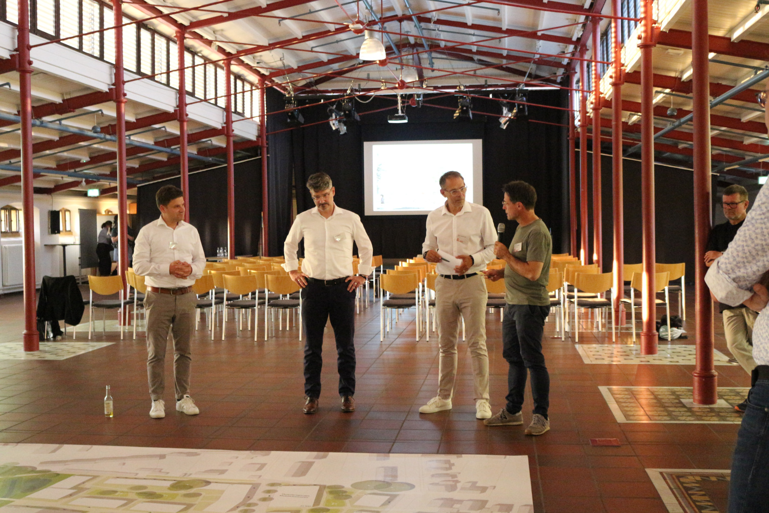 Bei der Informationsveranstaltung beantworteten Lars Bielefeld (Leitung des Bauamtes) und Frederik Suchla (Bezirksbürgermeister Mitte) zunächst dem Moderator Björn Sassenroth Fragen zum Ablauf des Konversionsprozesses zur Rochdale Kaserne. Darüber hinaus gingen beide auf die Chancen ein, die die Schaffung des neuen Quartiers mit sich bringt und gaben zum Schluss einen Ausblick auf die kommenden Schritte. Die Planer*innen der Büros Studio Schultz Granberg GbR und bbz landschaftsarchitekten berlin gmbh stellten dem Plenum das sogenannte „Kreislauf-Quartier-Rochdale“ vor (die Präsentation finden Sie hier) und standen im Anschluss für Fragen und Anregungen an den Stationen „Städtebau“ „Kreislaufwirtschaft“, „Mobilität“ und „Freiraum/Entwässerung“ zur Verfügung. Zur Veranschaulichung des Konzeptes dienten darüber hinaus ein kleines Modell zum Siegerentwurf des vorangegangenen Wettbewerbs und eine große Bodenplane, auf der die Rahmenplanung abgebildet ist.